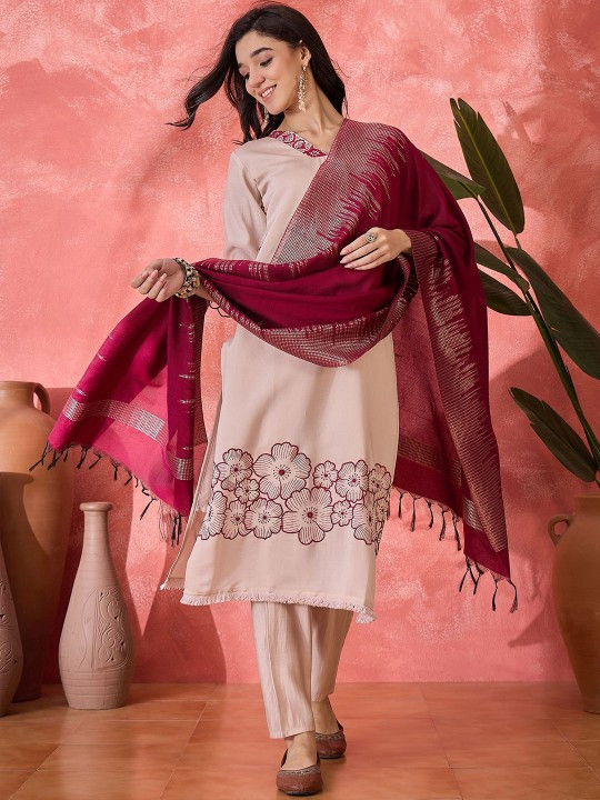 Pink and beige ethnic motif woven design dupatta